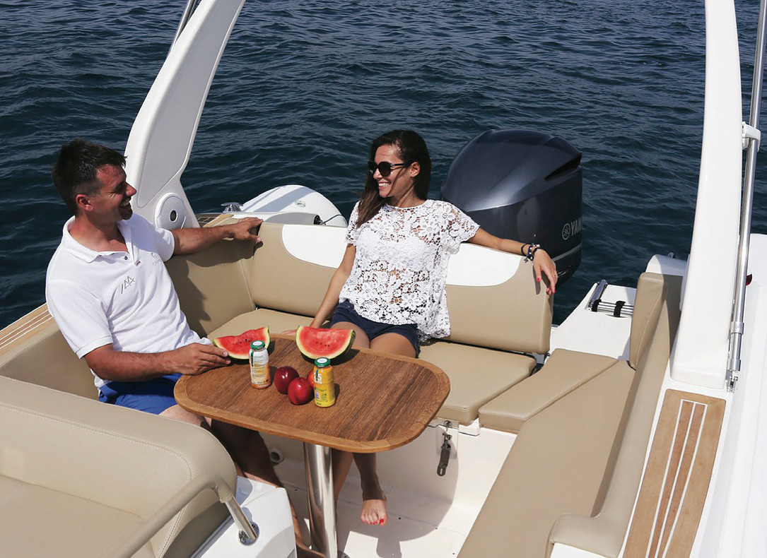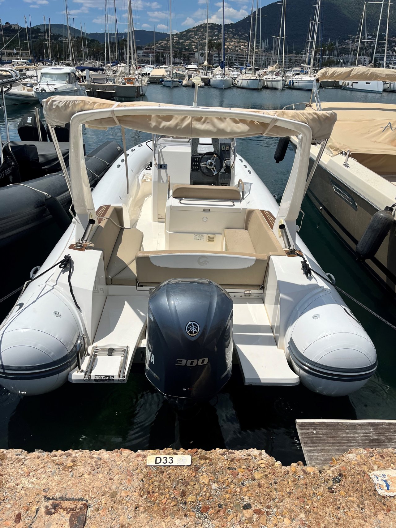 Ce bateau est équipé en plus du bain de soleil avant, d’un carre déjeuné arrière couvert par un taud de soleil de belle plateforme de bain avec échelle, d’une douchette, d’un GPS sondeur, de commande électrique, d’une direction hydraulique et d’un guideau électrique.