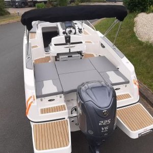 Equipé d’un moteur 175cv 4 tps, le bateau a un aménagement extérieur en U avec coussin et extension afin de faire un grand bain de soleil AR, bain de soleil AV, leaning post avec évier , douchette. Vous trouverez une table ainsi qu’une glacière igloo de 54 L .2 plateformes de bain avec échelle revêtement en seadeck sur la plateforme et plats bords, un grand bimini avec armature inox . une direction hydraulique., un guindeau électrique, batterie et coupe batterie, un poste radio avec 2 Haut parleurs, une cabine avec un couchage 2 personnes.